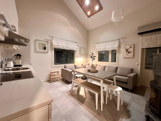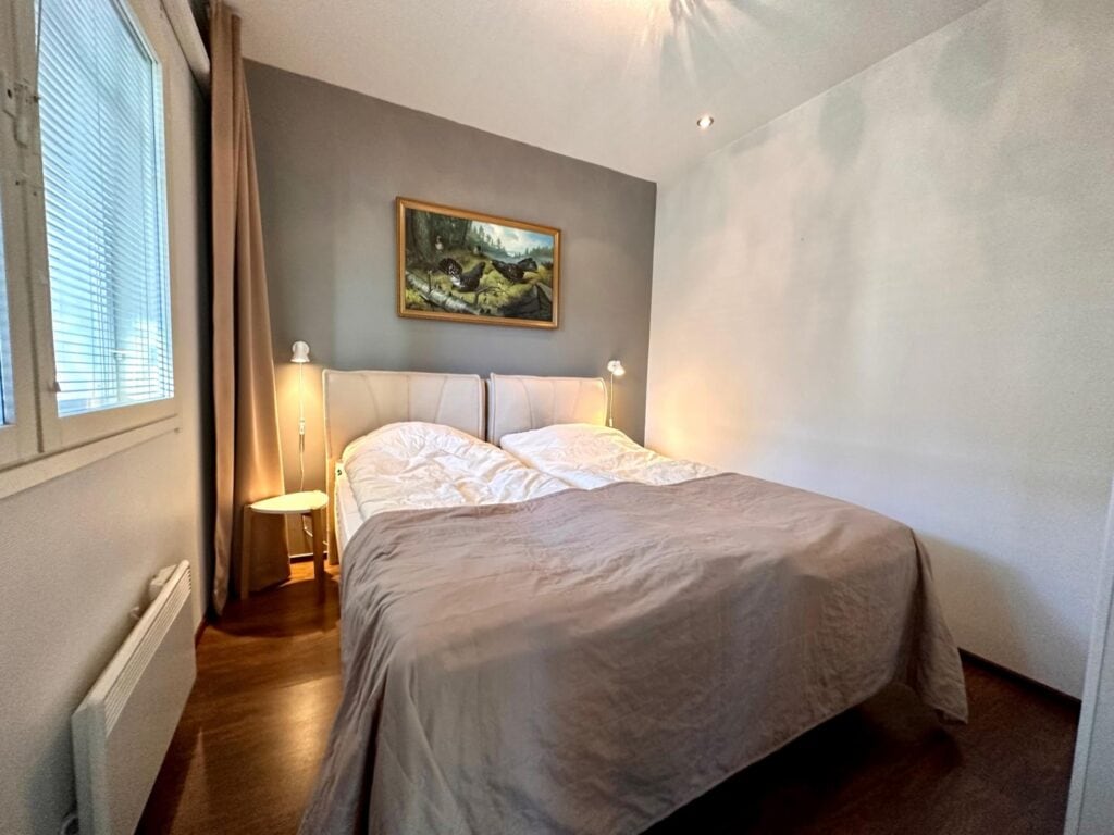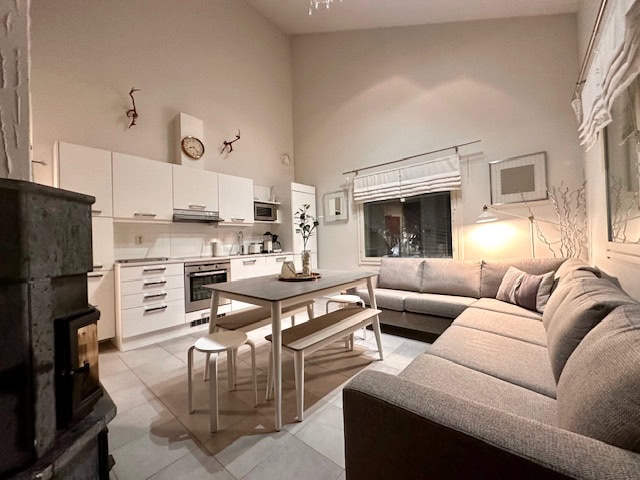 Lämminhenkisessä huoneistossa varustus kahdeksalle hengelle. Alakerrassa keittiö - olohuone yhtenäistä tilaa. Makuuhuoneessa parisänky. Saunaosasto ja erillinen wc. Yläkerrassa makuuhuoneessa neljä yksittäistä sänkyä ja parvella kaksi yksittäistä sänkyä, wc sekä parveke. Tunnelmaa tuo takka, jonka lämmöstä on mukavaa nauttia päivän aktiviteettien jälkeen. Lisäksi löytyy pyykinpesukone ja vaatteidenkuivauskaappi.