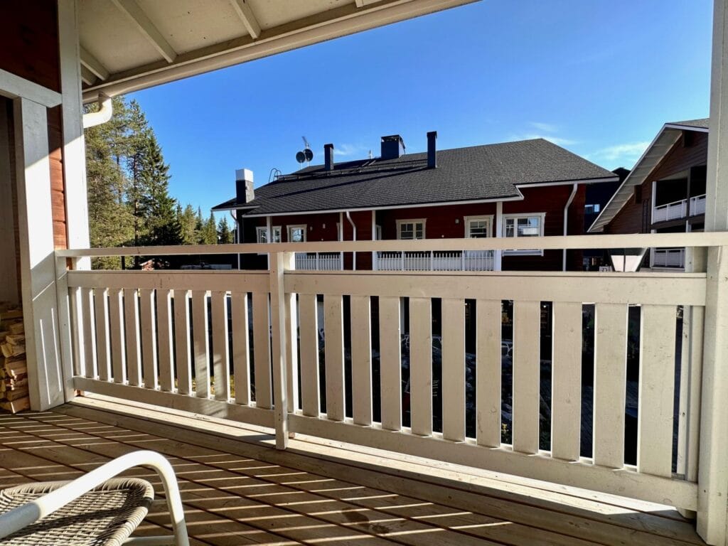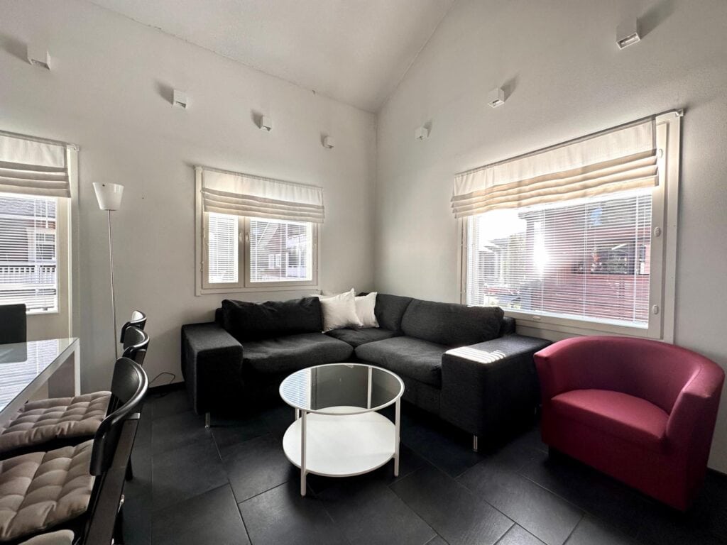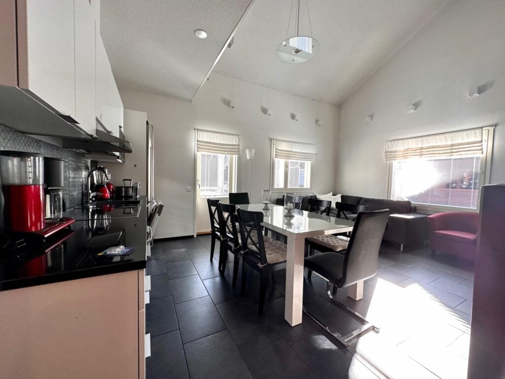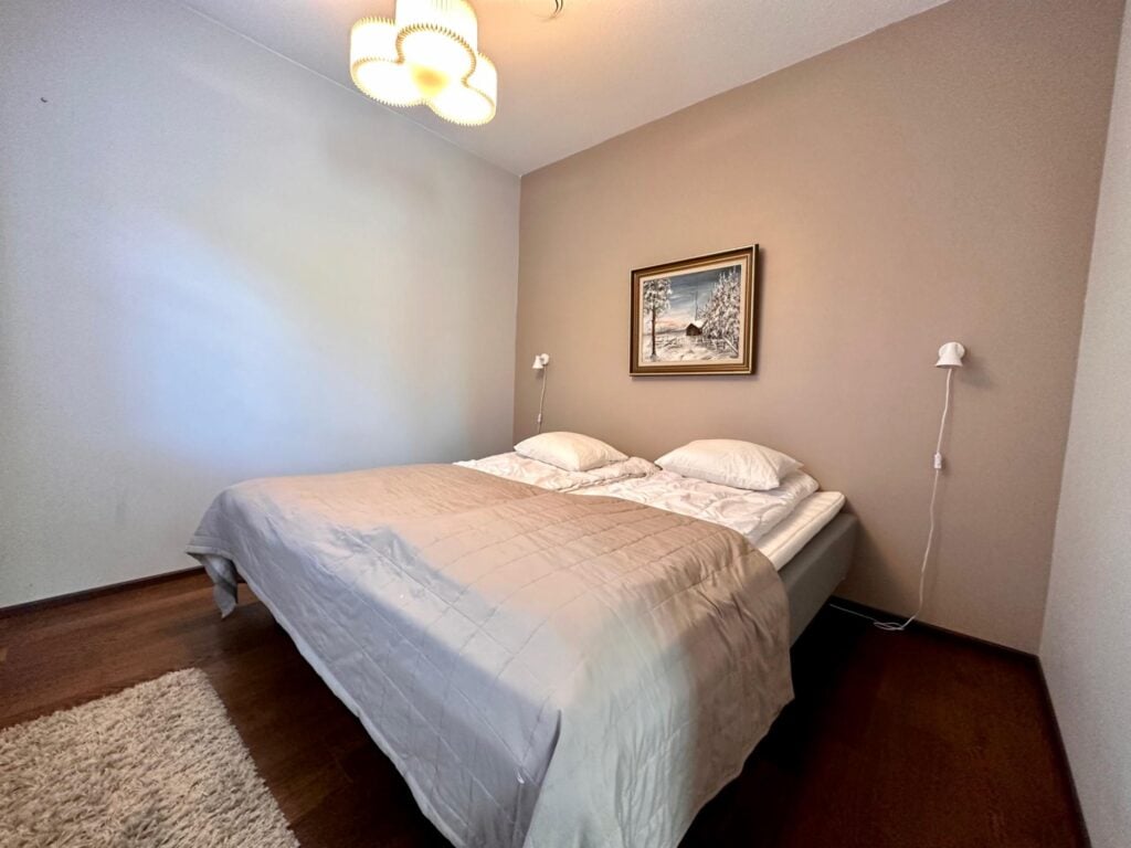 Lämminhenkisessä huoneistossa varustus kahdeksalle hengelle. Alakerrassa keittiö - olohuone yhtenäistä tilaa. Alakerrassa yksi makuuhuone. Saunaosasto ja erillinen wc. Yläkerrassa makuuhuone kahdella yksittäisellä sängyllä ja parvella neljä yksittäistä sänkyä, wc sekä parveke. Tunnelmaa tuo takka, jonka lämmöstä on mukavaa nauttia päivän aktiviteettien jälkeen. Lisäksi löytyy pyykinpesukone ja vaatteidenkuivauskaappi.