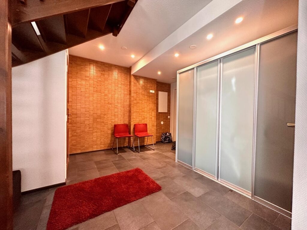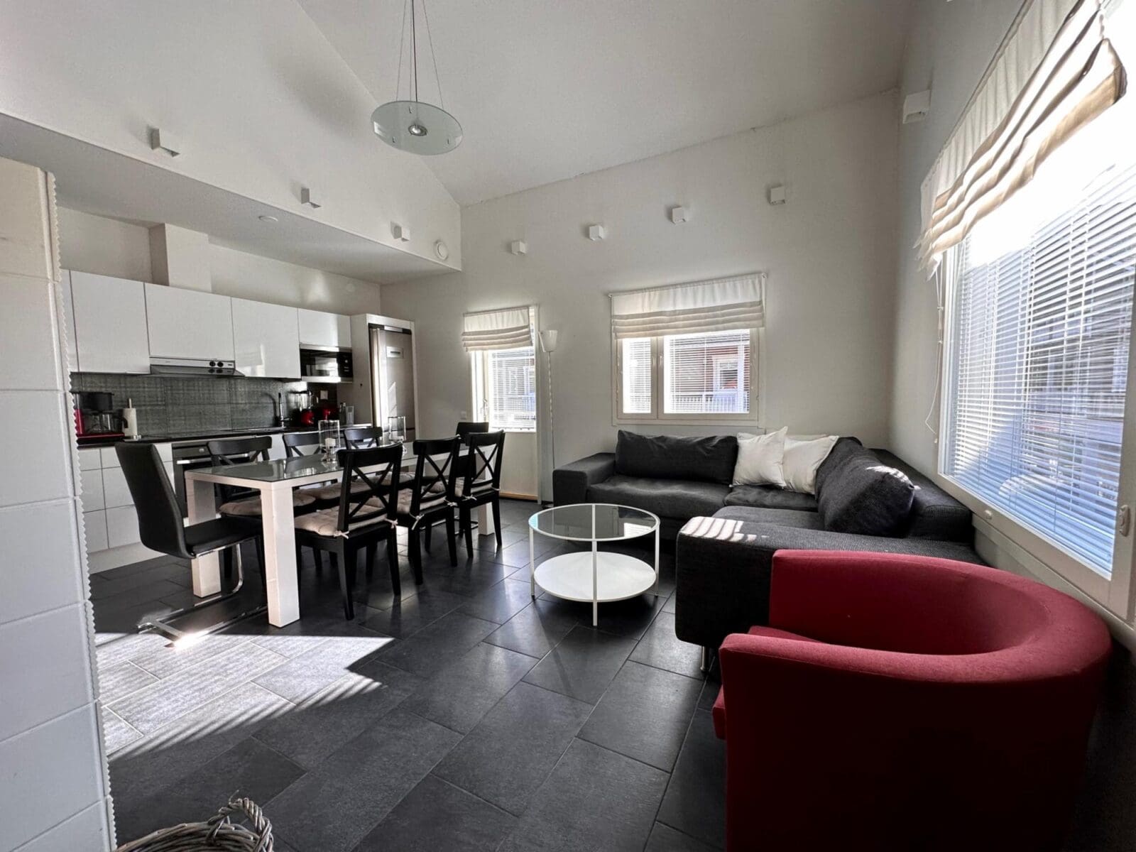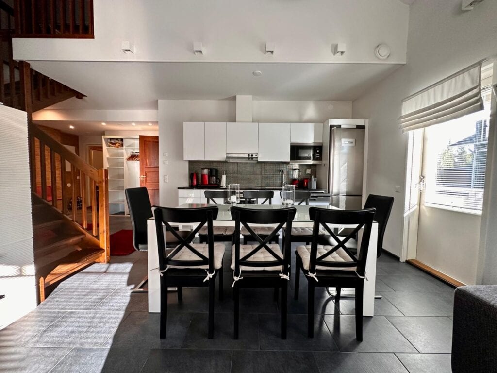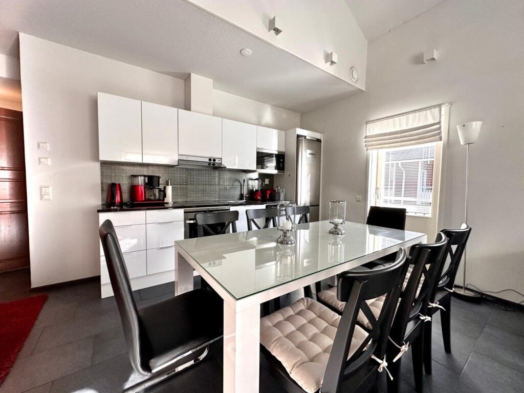Lämminhenkisessä huoneistossa varustus kahdeksalle hengelle. Alakerrassa keittiö - olohuone yhtenäistä tilaa. Alakerrassa yksi makuuhuone. Saunaosasto ja erillinen wc. Yläkerrassa makuuhuone kahdella yksittäisellä sängyllä ja parvella neljä yksittäistä sänkyä, wc sekä parveke. Tunnelmaa tuo takka, jonka lämmöstä on mukavaa nauttia päivän aktiviteettien jälkeen. Lisäksi löytyy pyykinpesukone ja vaatteidenkuivauskaappi.