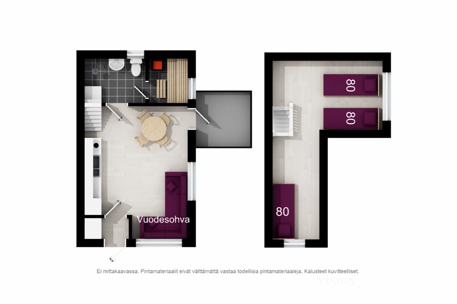*Vuodesohva alakerrassa ja parvella kolme erillistä sänkyä