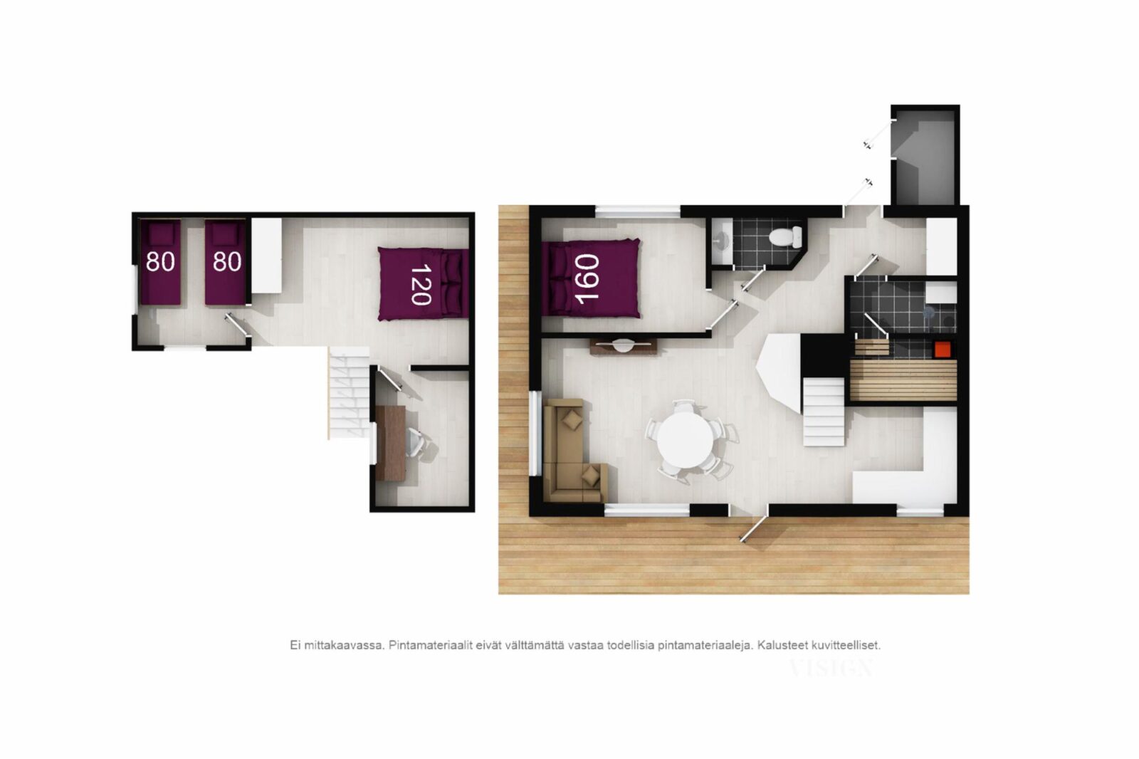 *2 makuuhuonetta 160cm ja 140cm sängyt